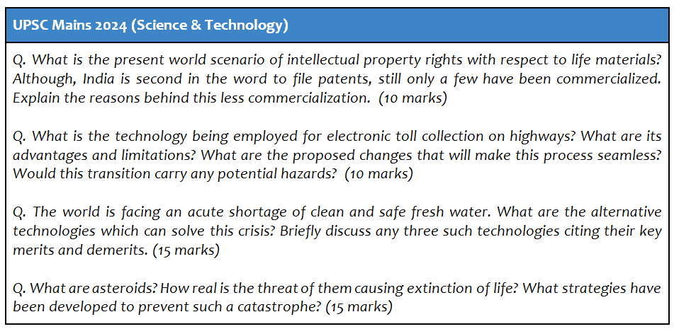 – In 2024, the Science & Technology segment highlighted significant advancements and challenges in intellectual property rights (IPR), the use of technology for public services (like electronic toll collection), and global concerns such as the water crisis and asteroid threats.