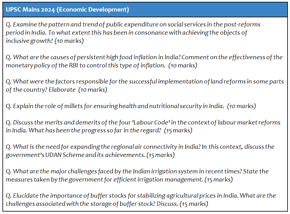 - Key Themes: The Economy section in GS Paper 3 of UPSC Mains 2024 maintained a balanced focus on long-standing issues like public expenditure, land reforms, and food inflation, while introducing emerging topics like the role of millets in India’s nutritional security.