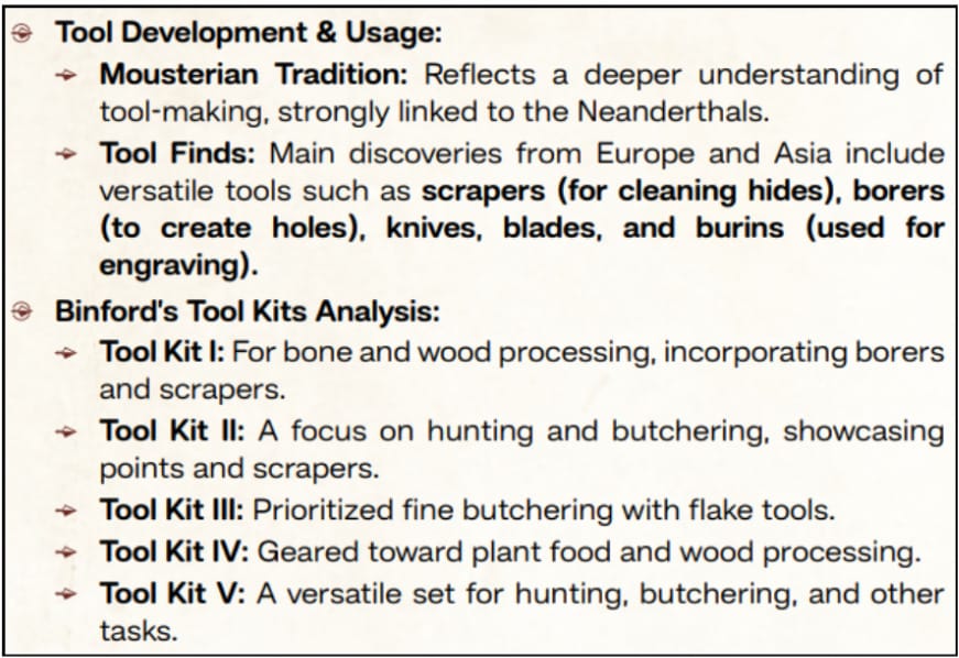 - The Tool Tradition: Define Mousterian as the Middle Palaeolithic industry, characterized by the Levallois prepared-core technique and a toolkit dominated by flake tools like points and side-scrapers.