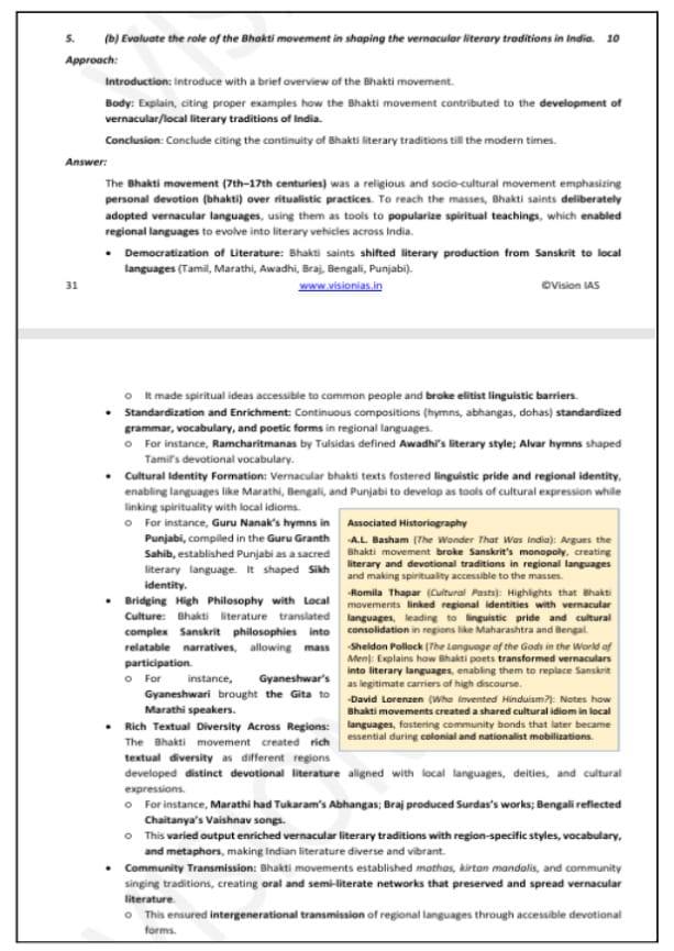 - Role of Bhakti Movement: The Model Answer to this question IAS provided a clear context about the role of Bhakti movement in the rise of vernacular literature of the period. This context would have assisted in writing a suitable context based introduction to the question.