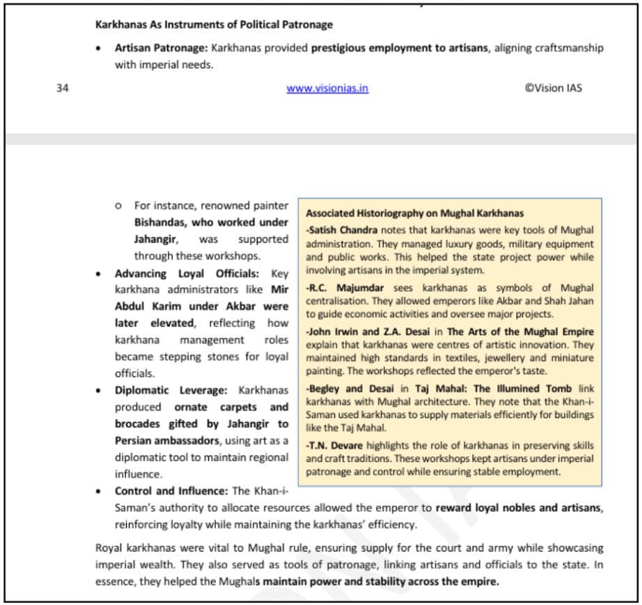 - Definition & Context: The Model Answer to this question by Vision IAS provided a clear introduction to the Mughal Karkhanas and their role in the Mughal Economy. This context would have assisted in writing a suitable context based introduction to the question.