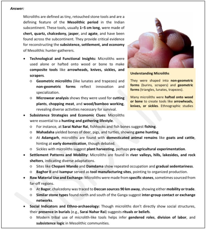 - Definition of Microliths: The Model Answer by Vision IAS provided a clear context about what Microliths are and their role in ancient India. This context would have assisted in writing a suitable definition based introduction to the question.