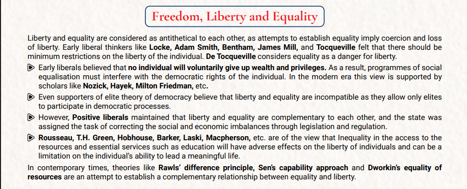 - Contextualisation of Liberty: The Vision IAS test series Model Answer on the relationship between liberty and equality provides a strong base for introduction to this question. By outlining classical liberal, socialist, and reconciliatory perspectives, it captures the core concepts and their historical tension which can be used as ready made intro for the question.
