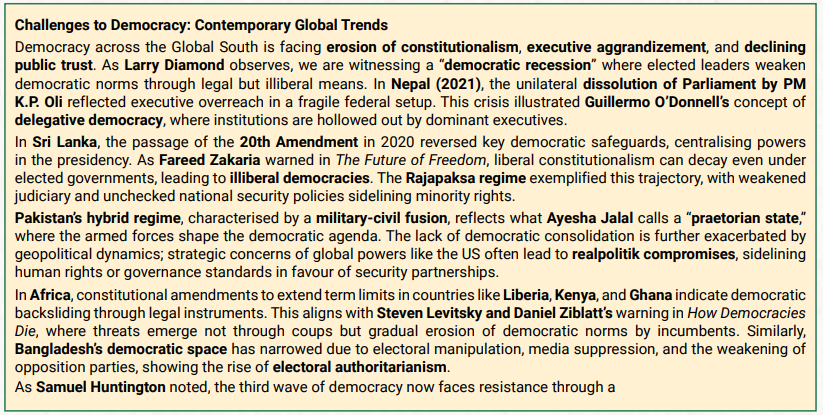 - Democratic Backsliding: This was a complex topic that demanded candidates to analyse how global democracies are evolving in the face of internal and external pressures. Aspirants had to show a nuanced understanding of shifting political landscapes worldwide.