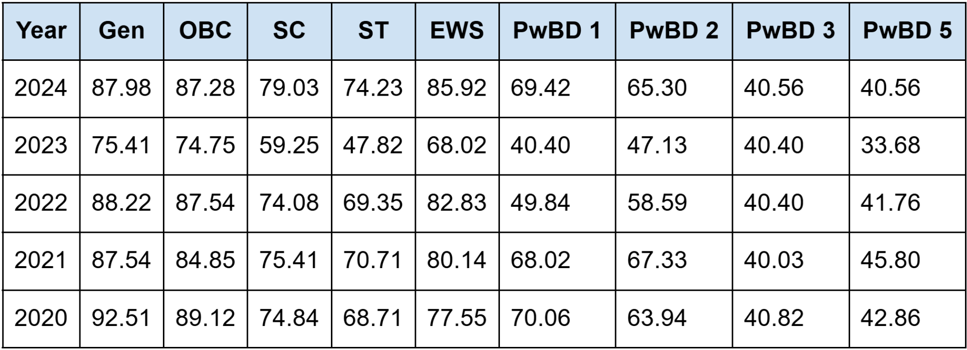 A. General category cut-offs have ranged from 87.98 (2024) to 92.51 (2020).
