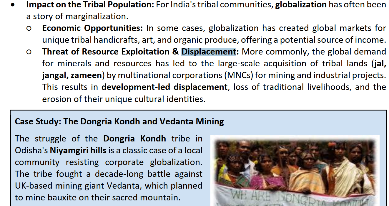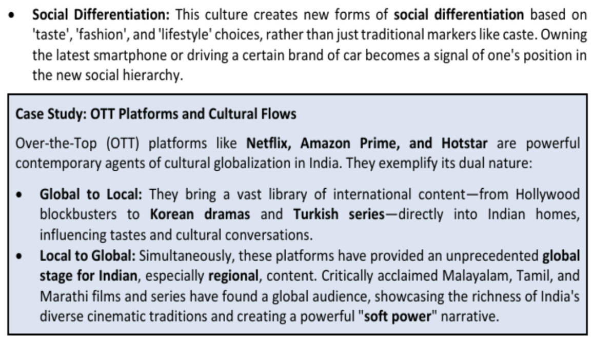 - Examples: The VAM highlights how globalization encourages brand-driven lifestyles (gadgets, cars, luxury items), while also showing alternative dimensions such as glocalization and cultural hybridity (e.g., McAloo Tikki at McDonald’s, Hinglish, fusion music). It further notes the export of Indian traditions like Yoga and Ayurveda, demonstrating that globalization is not unidirectional but also spreads local cultures globally.