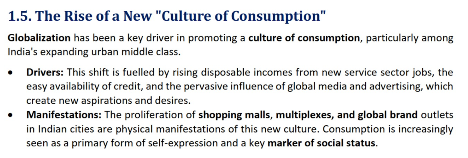 Analytical Depth: The material explains the culture of consumption under globalization, linking identity and status to fashion, fast food, and global brands, which supports the argument that globalization fosters aggressive consumerism. It also discusses conspicuous consumption as the practice of buying goods and services mainly to display status and wealth, not for functional use, thereby reinforcing the idea of a consumer culture shaped by globalization.