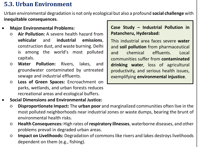 - Examples: The material cites the Chennai Water Crisis (2019) to show how water scarcity from over-extraction and erratic monsoons disproportionately affected poor households and small businesses. It also notes that the urban environment vs poor’s needs dilemma is visible in issues like air pollution, loss of green spaces, and the rising cost of living, which compromise health and reduce purchasing power.