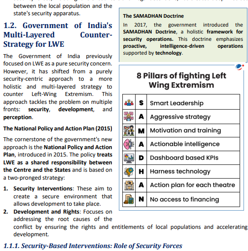- The SAMADHAN strategy is explained in detail, outlining the government’s comprehensive approach involving Security, Action, Motivation, Development, and more.