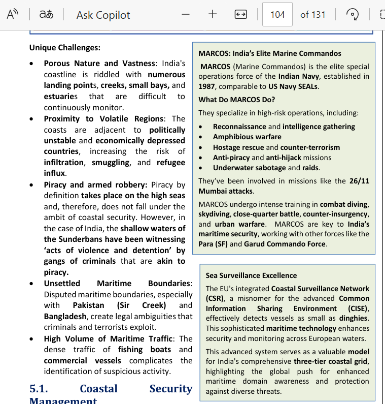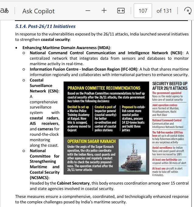 - Importantly, it examines the post–26/11 reforms, such as the creation of coastal police stations, coordination mechanisms, and enhanced surveillance, which can be used as ready-made analytical points in the body of the answer.