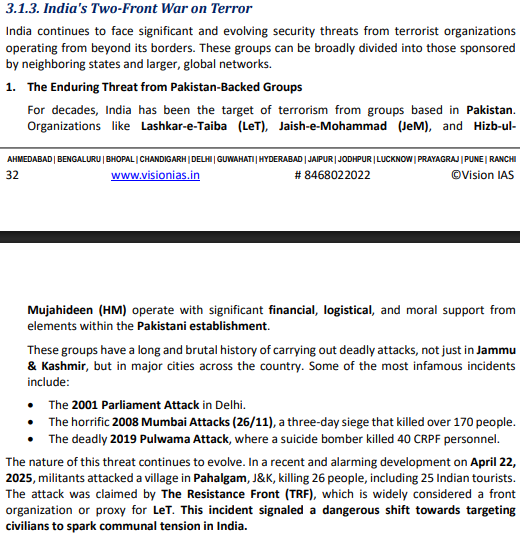 - Analytical Depth: The VAM provides an in-depth exploration of what terrorism entails—covering the role of non-state actors, their strategies, funding mechanisms, networks, and operational approaches. It also includes key examples, both global and domestic, which serve as ready references to enrich answers.