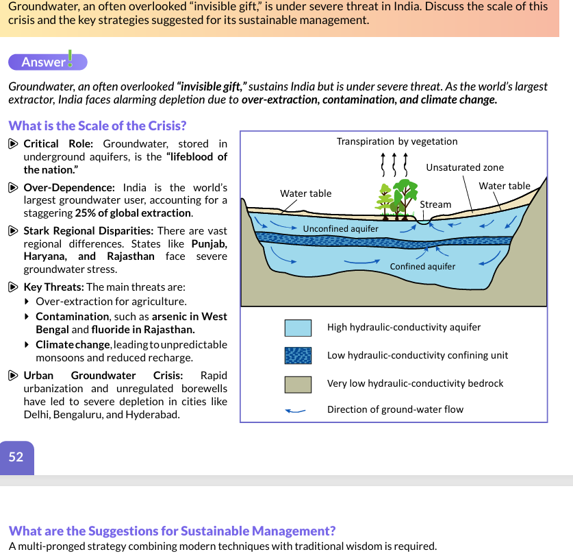 - It also highlights factors contributing to groundwater contamination, including industrial effluents, agricultural run-offs, and urban waste, which serve as ready-made value additions for enriching answers.