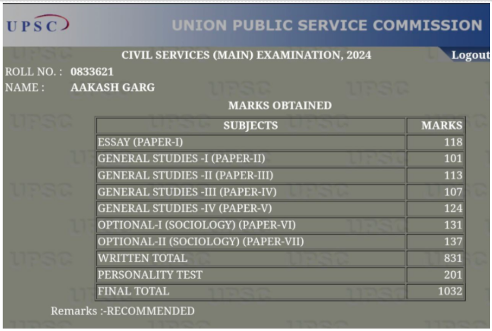 - Aakash Garg’s UPSC CSE 2024 Mark sheet
