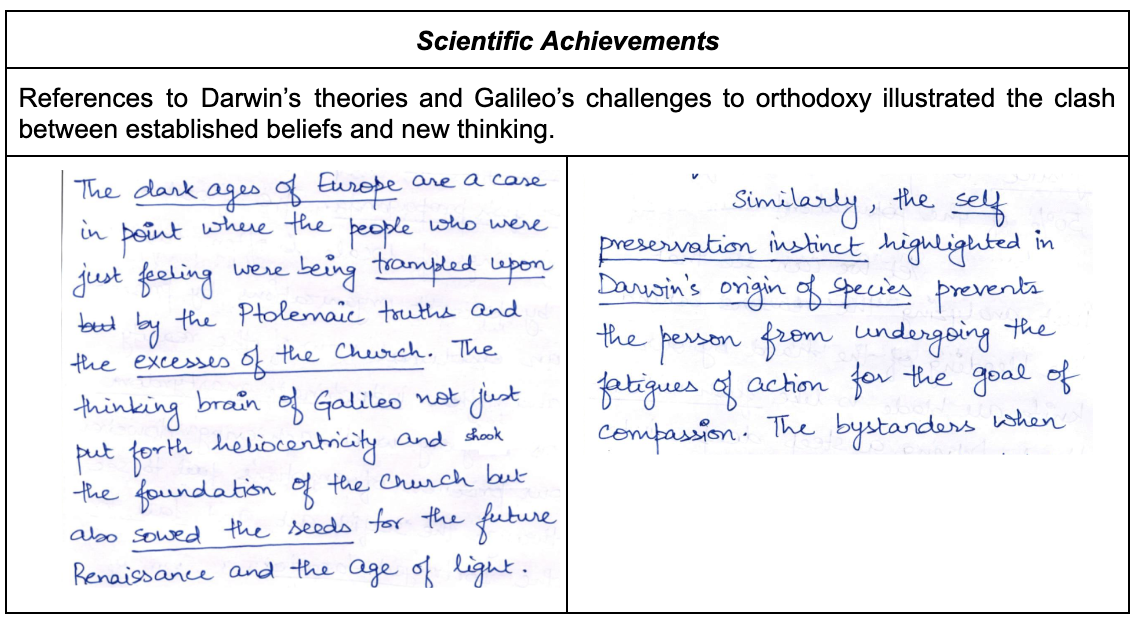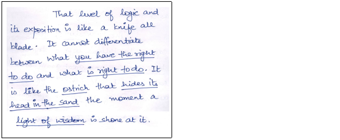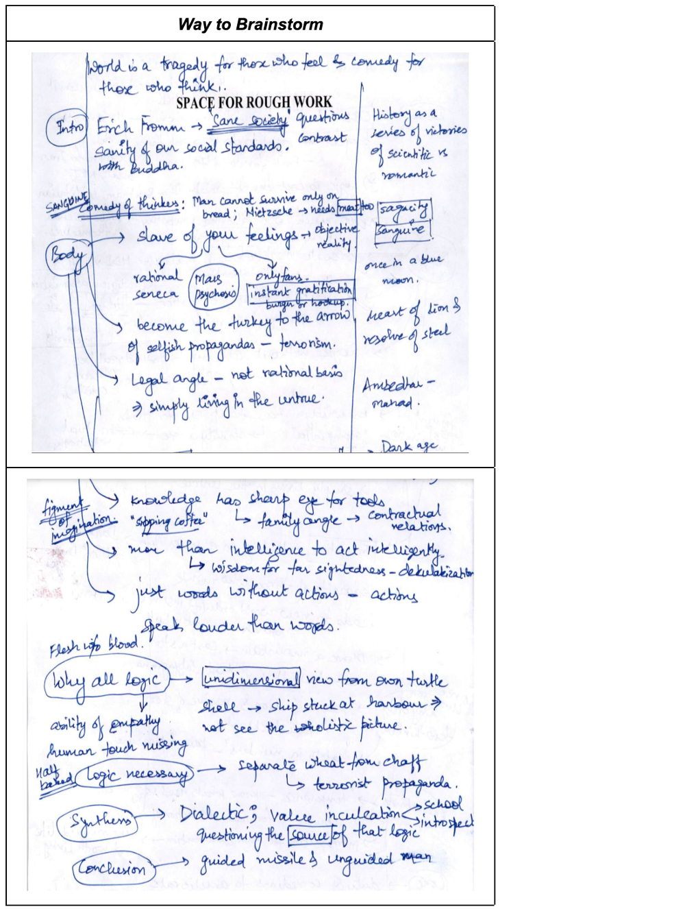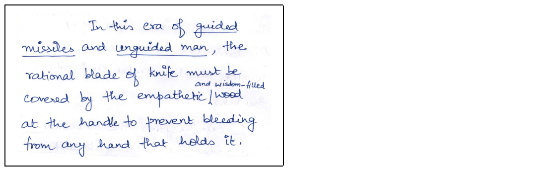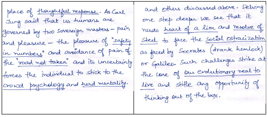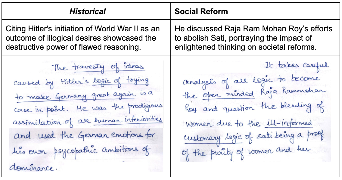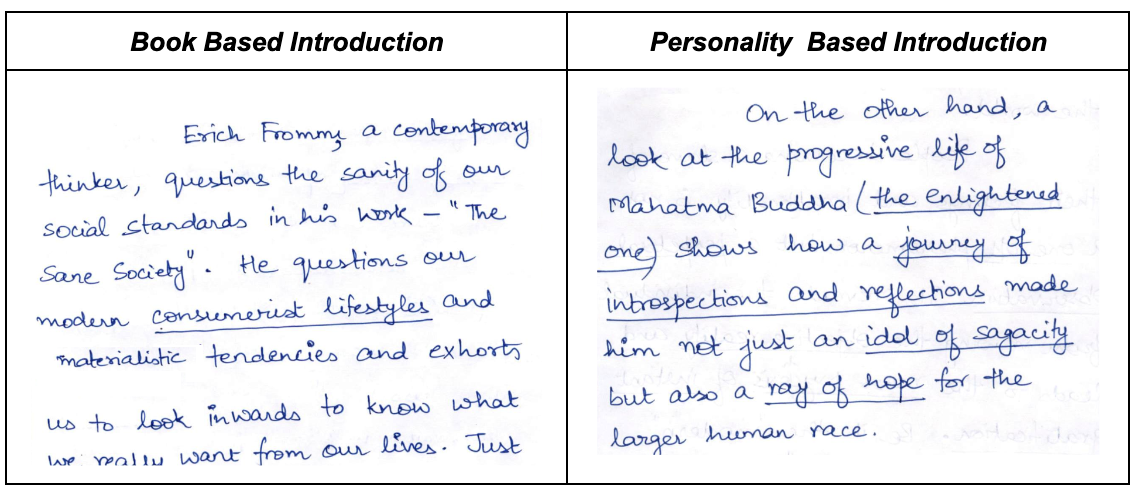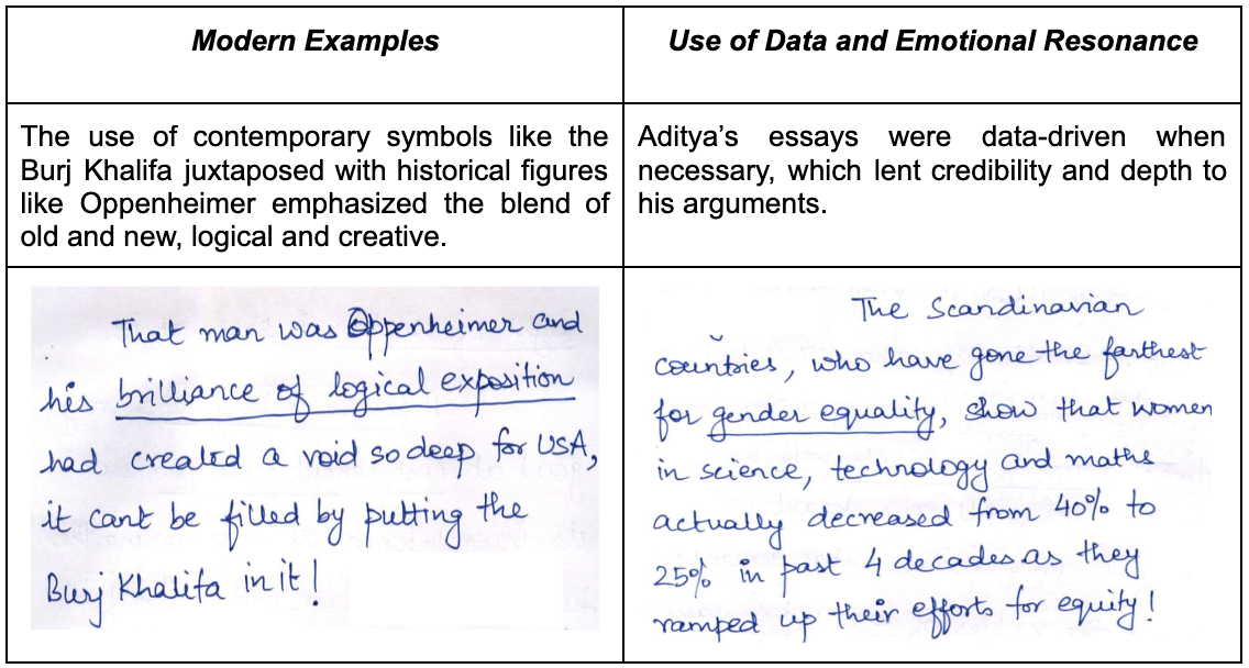 Aditya started his essays with captivating introductions. He skillfully incorporated quotes and references from diverse personalities such as Erich Fromm, Mahatma Buddha, and J. Robert Oppenheimer. This approach not only grabbed the examiner’s attention but also set a strong foundation for the philosophical discourse that followed. By weaving historical narratives into the introductions, he established a broad, insightful context for his arguments.