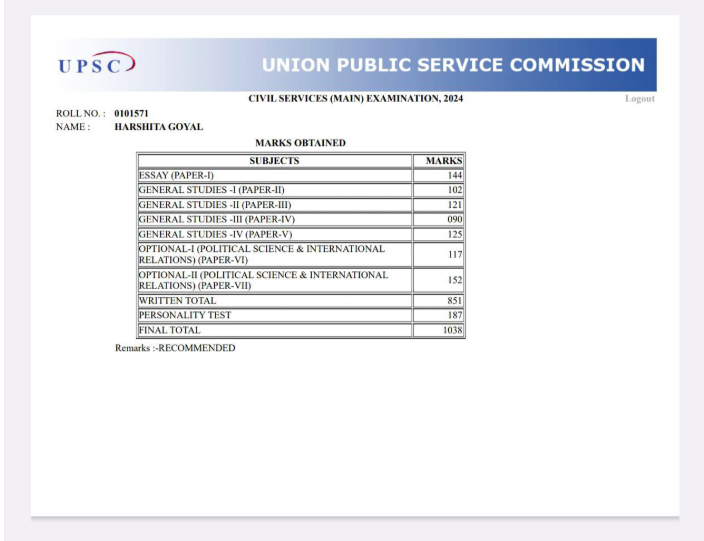 - Harshita Goyal’s UPSC CSE 2024 Marksheet