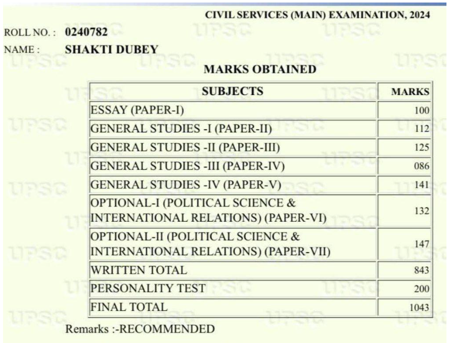 - Shakti Dubey’s UPSC CSE 2024 Marksheet