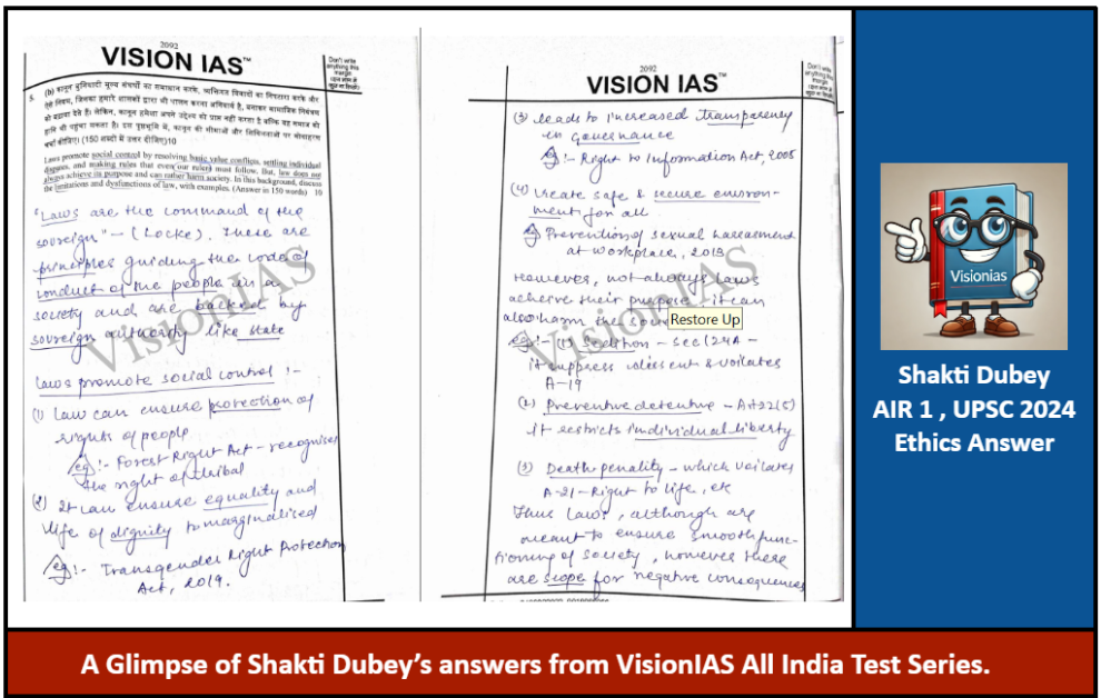 The extensive repository of toppers’ copies—featuring achievers like Aditya Srivastava (AIR 1, 2023), Ishita Kishore (AIR 1, 2022), Gamini Singla (AIR 3, 2021), and Shubham Kumar (AIR 1, 2020) among others—reflects the strength of a holistic VisionIAS learning ecosystem built over years of academic excellence. More than just isolated subject copies, this curated collection spans GS papers, Ethics, Essay, and Optionals, drawn from initiatives like the All India Test Series and Abhyaas, offering aspirants an integrated view of preparation strategies, answer-writing nuances, and the broader environment of continuous mentorship and rigor that drives success in the UPSC Mains.